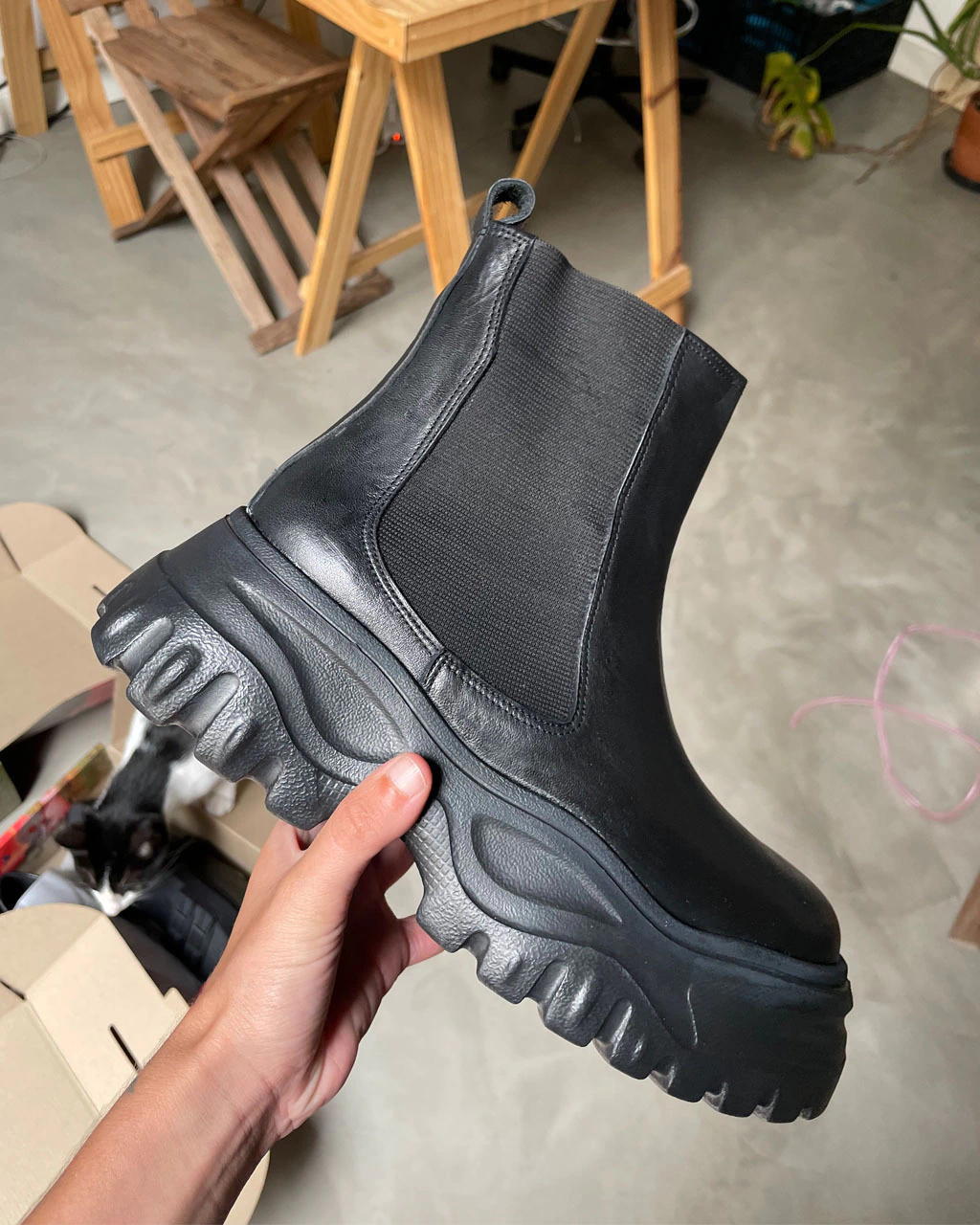 Mid-calf boot with elastic side panels. Wide fit, lightweight yet ultra-resistant rubber sole with a 4.5 cm platform height.