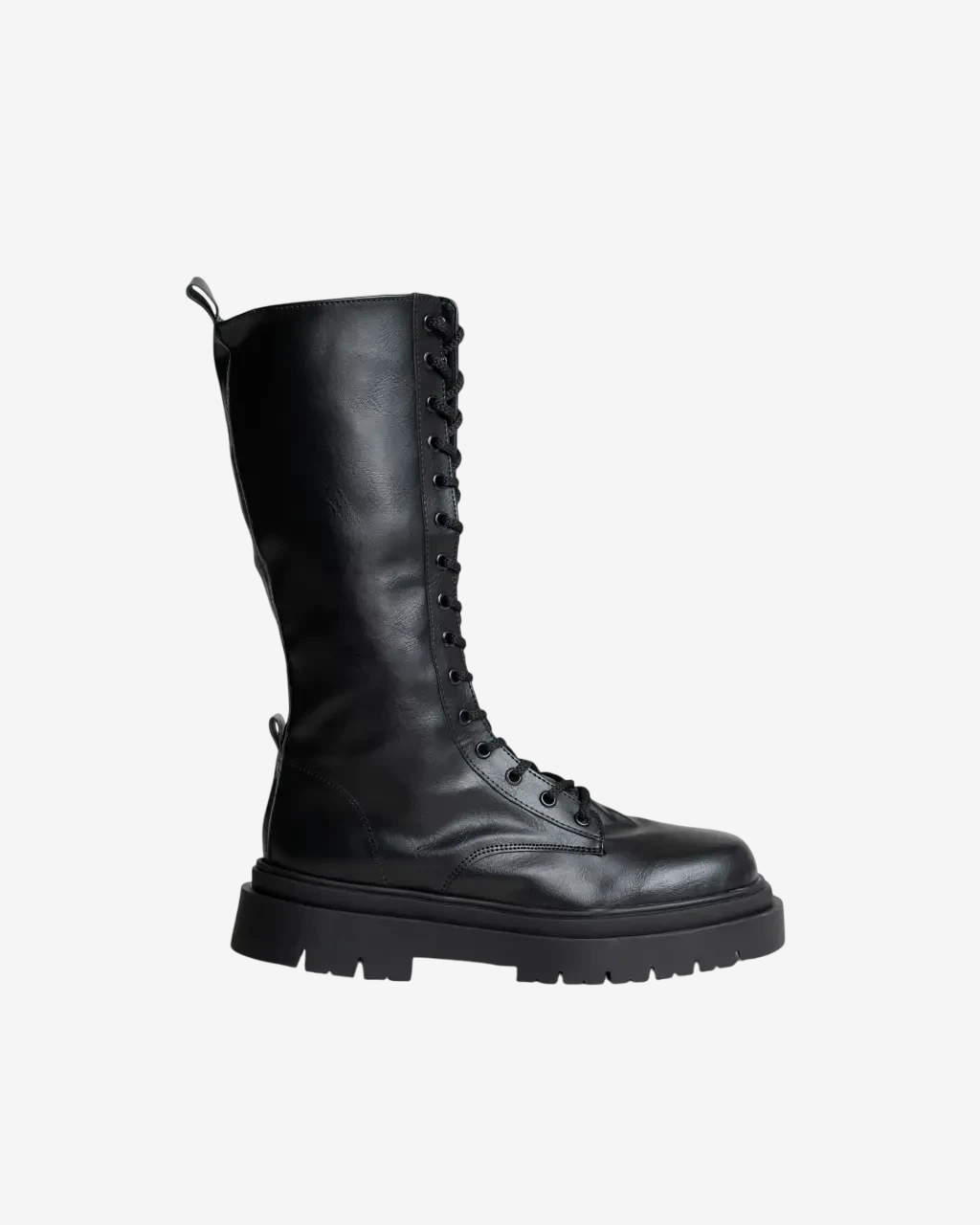 Borcegos de caña alta (26 cm) con 15 ojales y cierre lateral. Suela ancha de goma TR con 3,5 cm de altura. Confeccionados con capellada, forro y plantilla de cuero vegano. Horma fiel al talle.